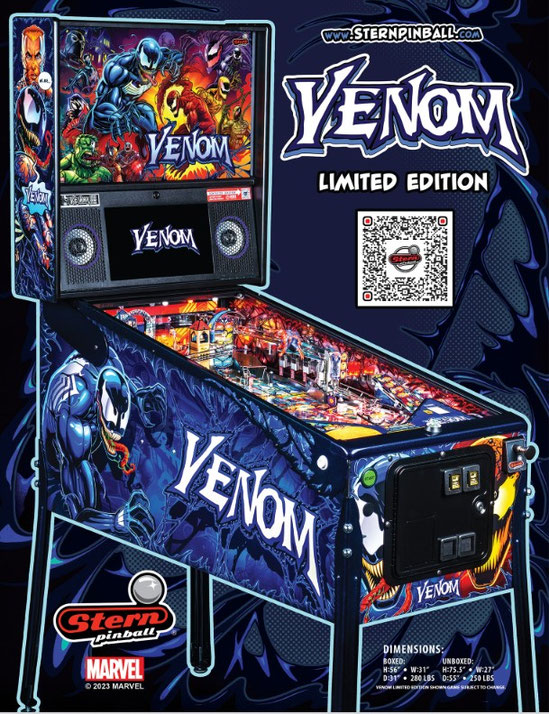 Les jeux de flipper Venom de Stern plongeront les joueurs dans le chaos de l'univers Marvel de cet anti-héros, avec plus de 20 personnages dont : Eddie Brock, Flash Thompson, Gwen Stacy, Peter Parker, Black Suit Spider-Man, Miles Morales, Riot, Agony, Lasher, Phage, Doppelganger, Venomized Hulk, Venomized Wolverine et Venomized Captain America.